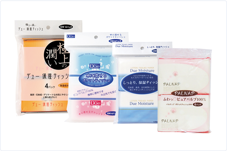 肌にやさしい、安心の国産ポケットティッシュ。企業のプロモーション用から日常で使う一般品まで、多彩なラインナップをご用意しています。