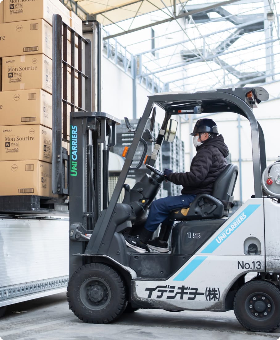 フォークリフトを自在に操り、完成した製品の倉庫格納や、出荷に向けたトラックへの積み込みを担当します。