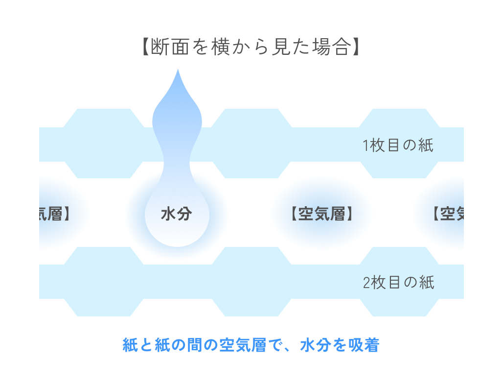 紙の使い心地は、その構造に大きく左右されます。例えば、独自の「ポイント トゥ ポイント製法」では、紙の層の間に空気を含ませることで、ふっくらとした厚みと優れた吸水性を実現。肌に触れた瞬間の、格別な柔らかさを生み出す、私たちの基幹技術です。